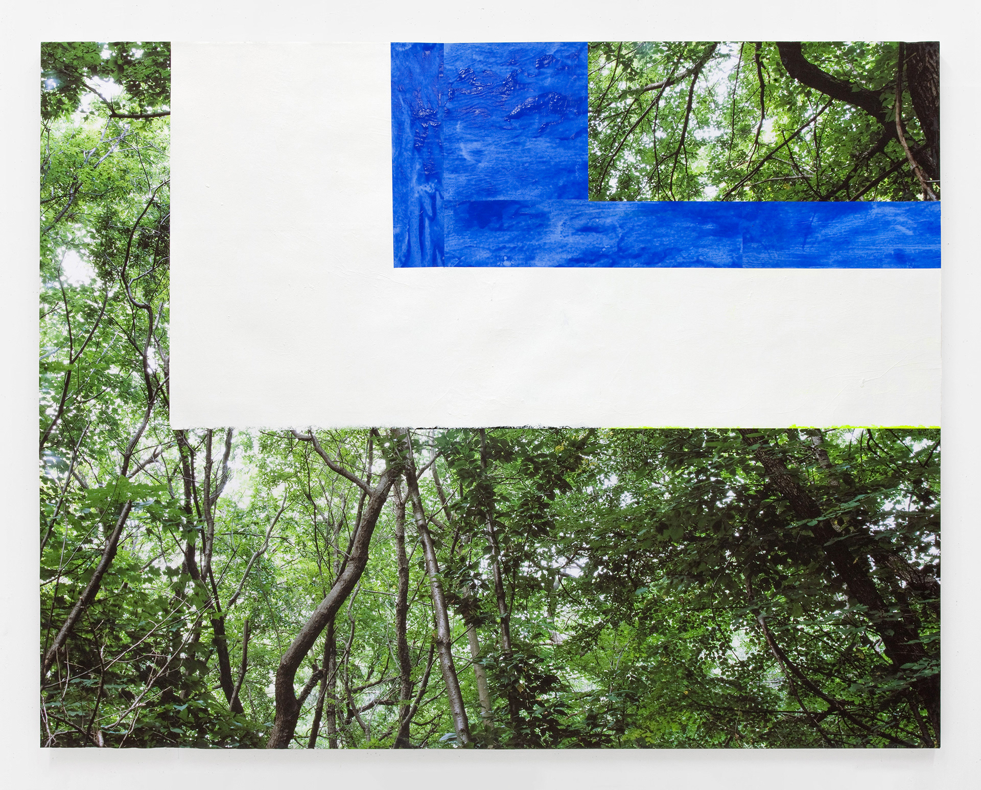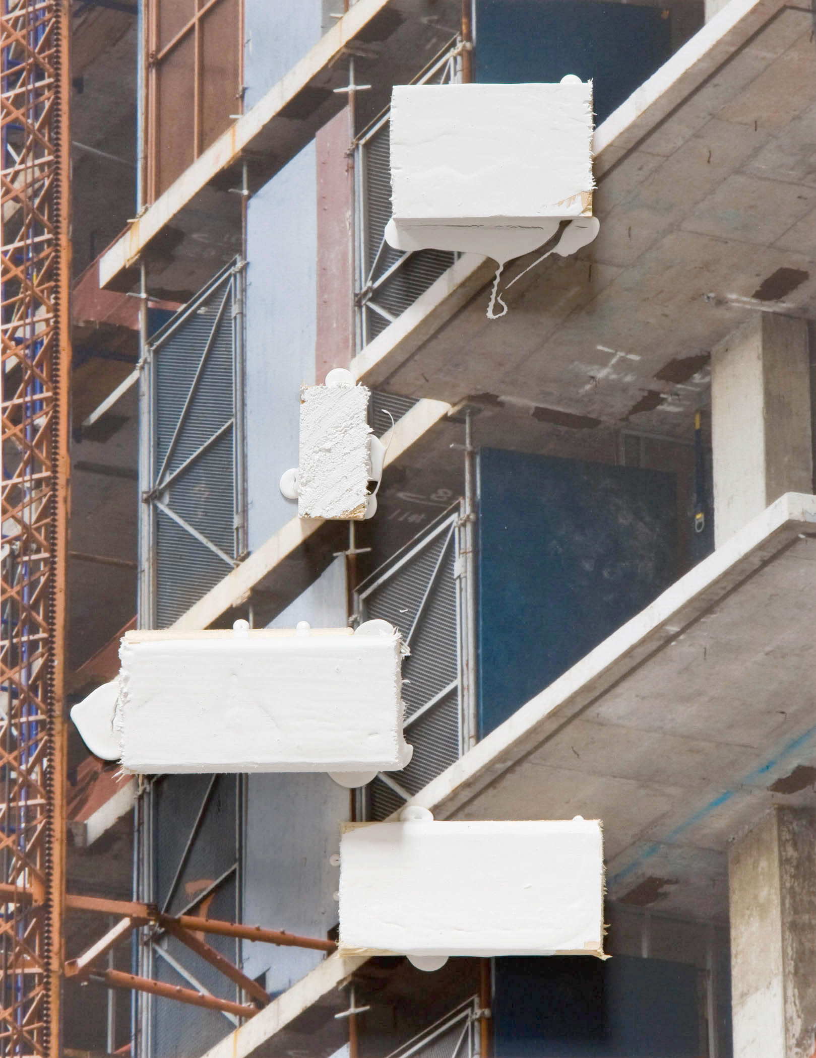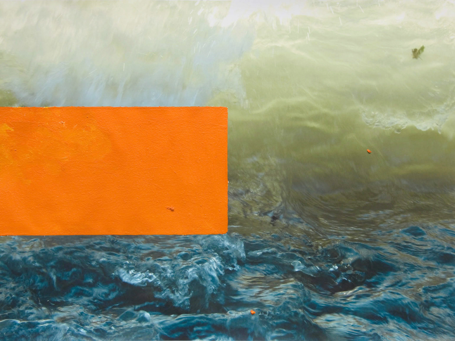 While the photographs are Hyde’s own, the images do not readily identify him. They are views of construction sites, clouds and waves. In one of the smallest pieces in the exhibition, A Flow, 2008, a dandelion provides ground for a pasty blue paint snarl executed in solidarity with the single flower, a response made in the language of abstract painting; it’s a microcosmic tonic to the old standoff between painting and photography. A romantic tone, and the occasional Delacroix sky, is maintained throughout the exhibition: the materials here are always teaching each other little constructive lessons, and this dialogue infuses the prosaic construction sites with poignancy. Photography, spectral as much as pragmatic, is here, as ever, evasive--delivering to us moments which, as Roland Barthes wrote, “could never be repeated existentially.”