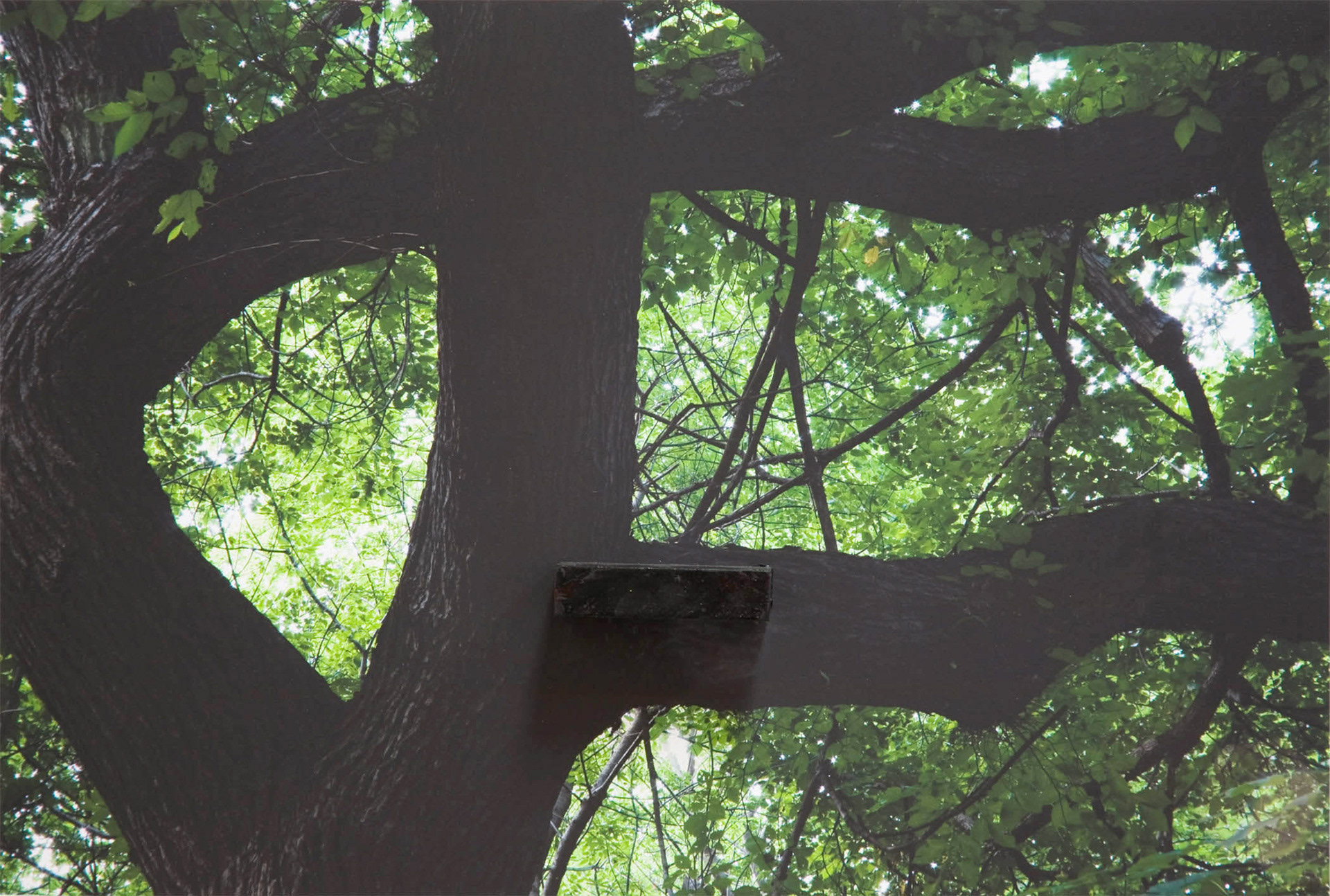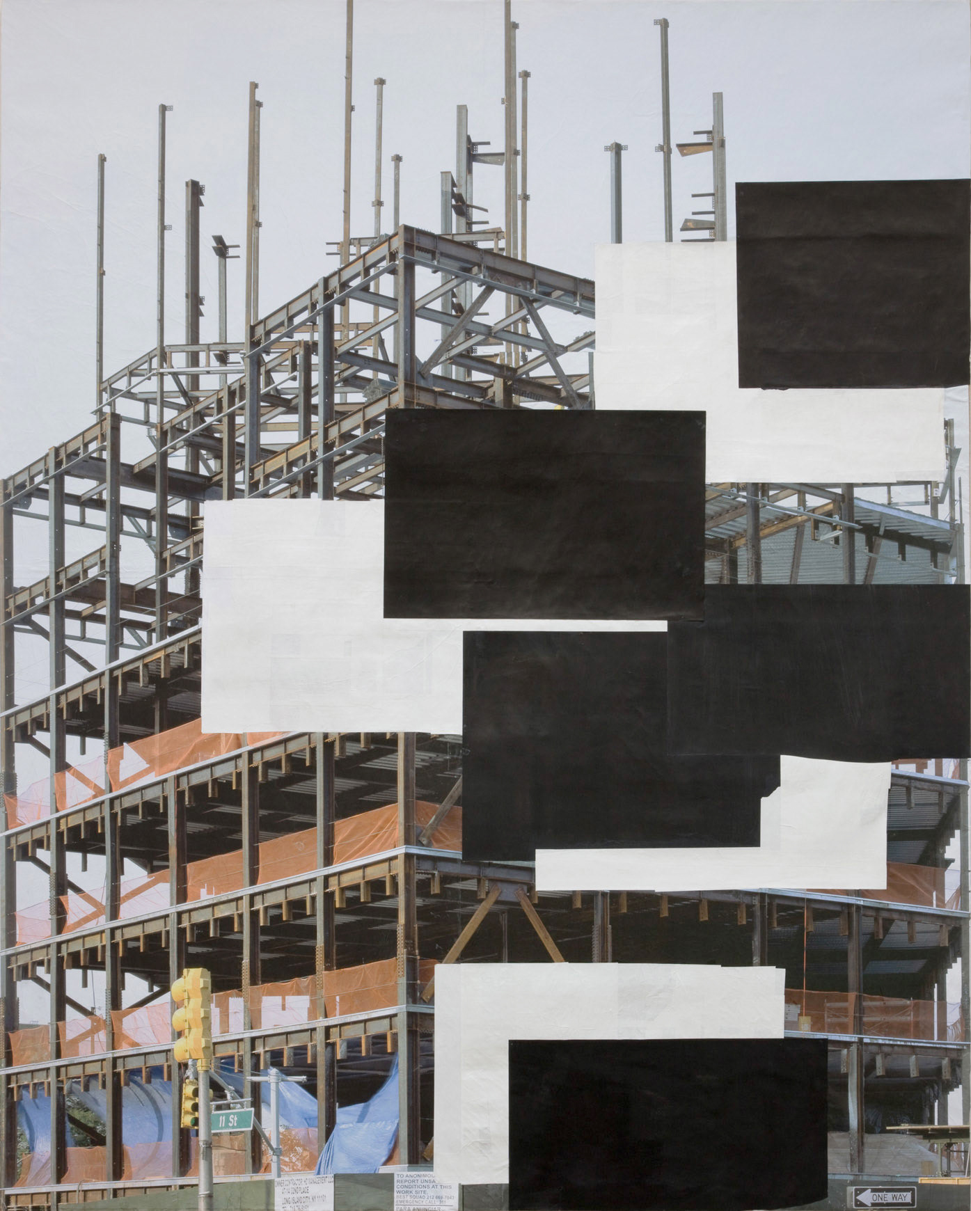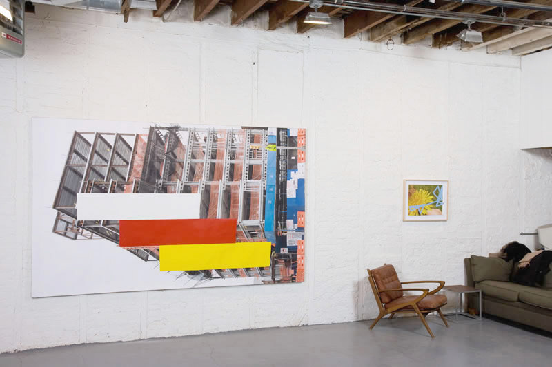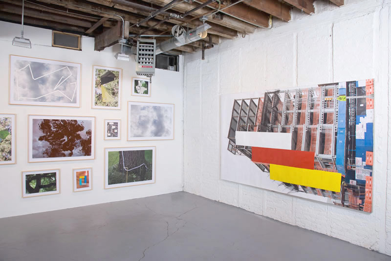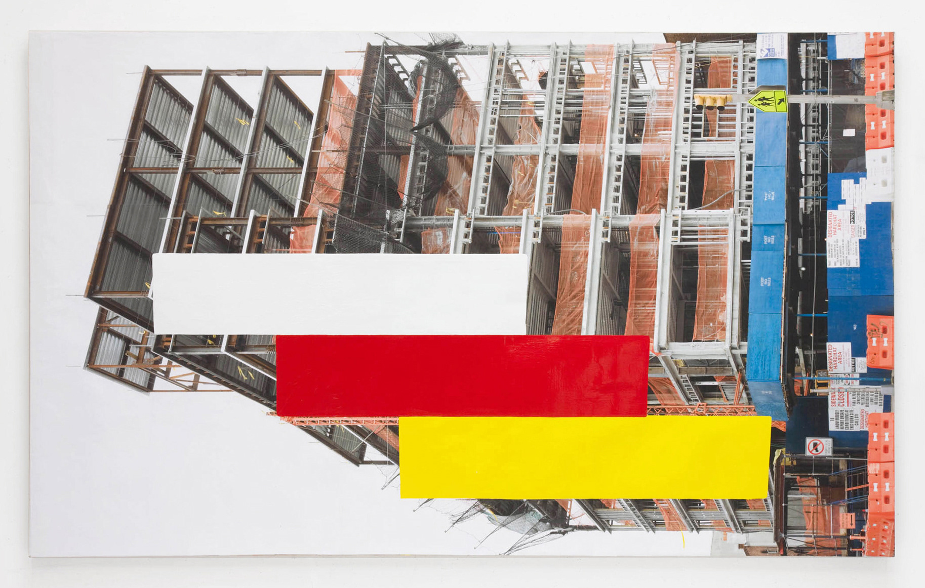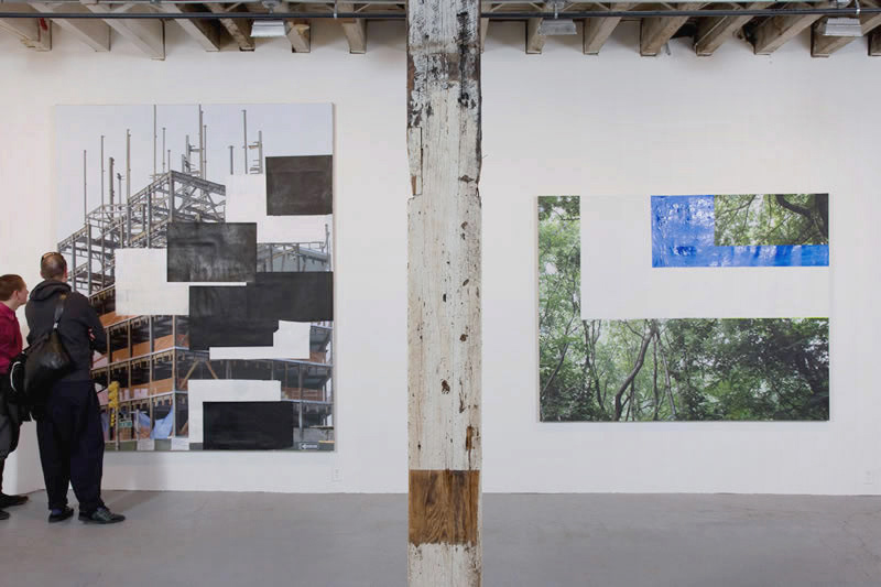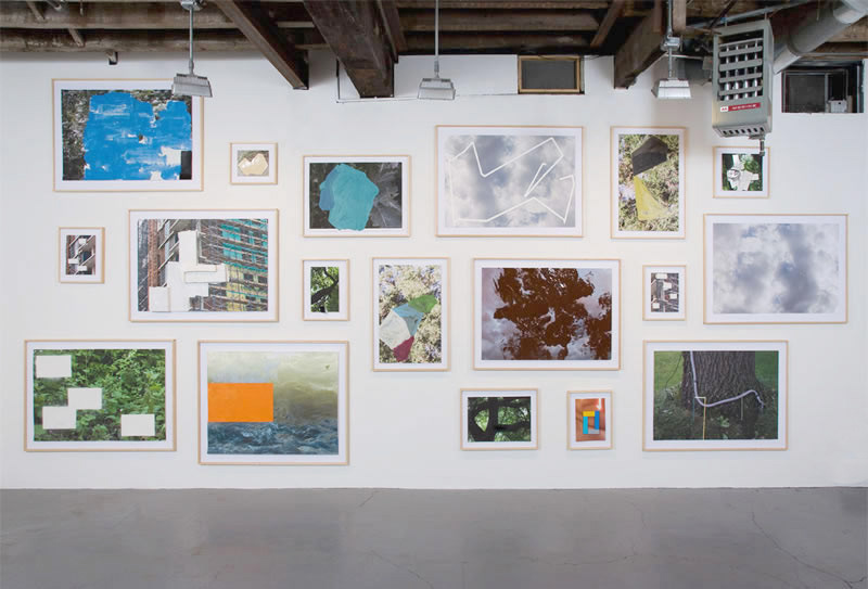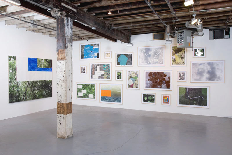After his influential investigations of paintings as objects of some bulk, Mr. Hyde returns to flatness. Now structure is provided by digital photographs — all taken by the artist and often printed quite large — of half-built structures, construction sites, clouds, trees, close-ups of the human hand and a single flower. Appended with strips of tape, painted shapes and bits of painted wood or Styrofoam, these works function like drawings. They show how Mr. Hyde thinks and what he looks at, something of his working process, and above all his desire to avoid ruts.  (Roberta Smith)