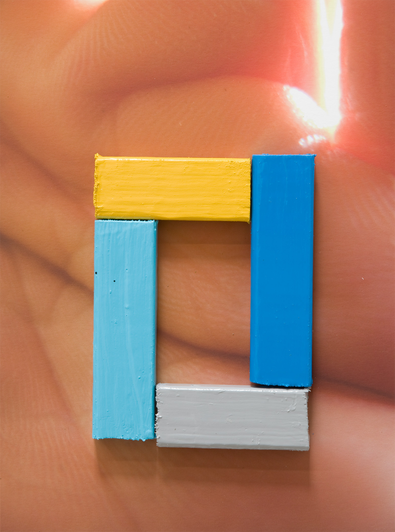 The raw material for this exhibition of new work by James Hyde, paintings on photographs made from 2006-2009, is enamel and acrylic paint, digital prints and linen. Styrofoam, papier-mâché, silicone and wood all make appearances, but if perhaps the most famous formulation of the definition of painting is that of Maurice Denis, who wrote that “a painting…is essentially a flat surface covered with colors assembled in a certain order,” then Hyde’s paintings investigate with energy the collision of paint on the flat field of a photographic surface. Everything else builds from this premise.